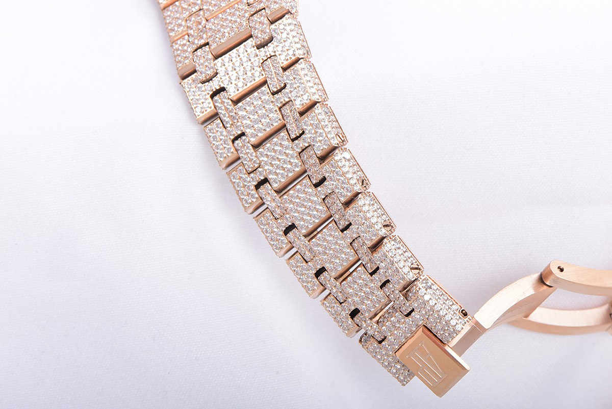 Strap: Diamond paved 18K rose gold plated stainless steel bracelet