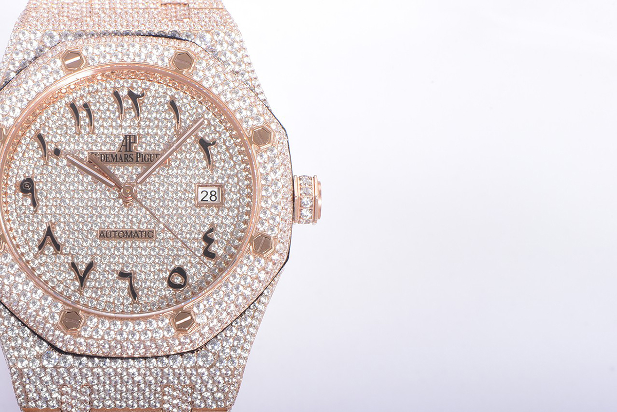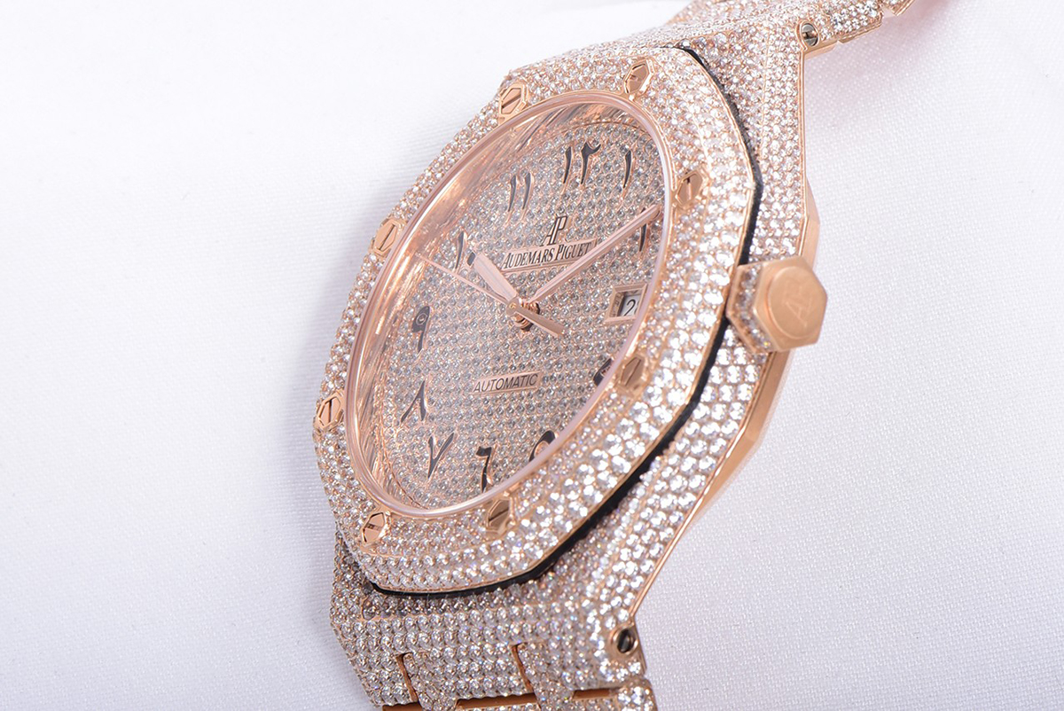 Bezel: Full paved diamonds/polished 18K rose gold plated stainless steel bezel with recessed bezel screws