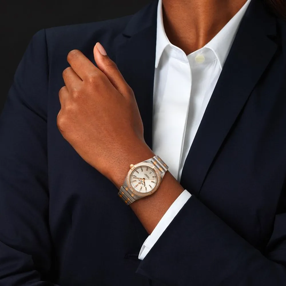 - 32mm stainless steel and 18K red gold case with the iconic Rouleaux bracelet