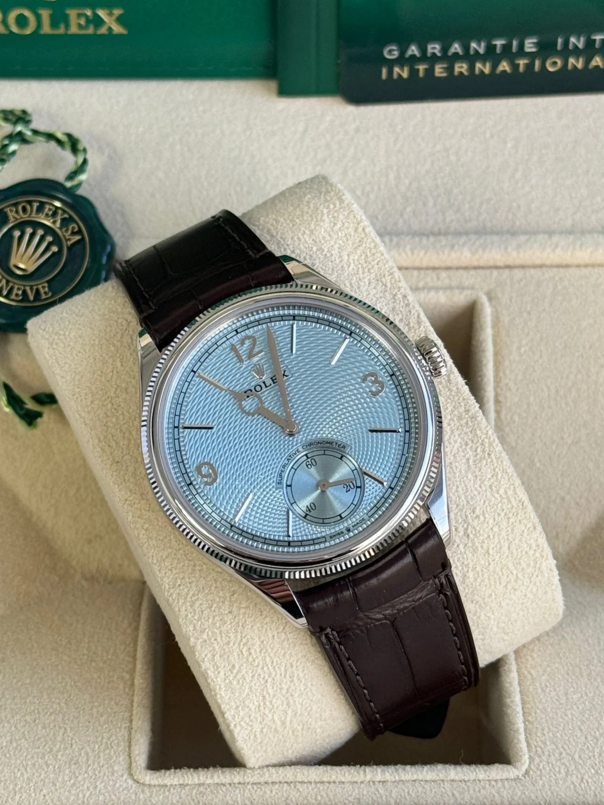 • Rolex 1908 Platinum Ice Blue Dial Brown Alligator Strap - 52506-0002