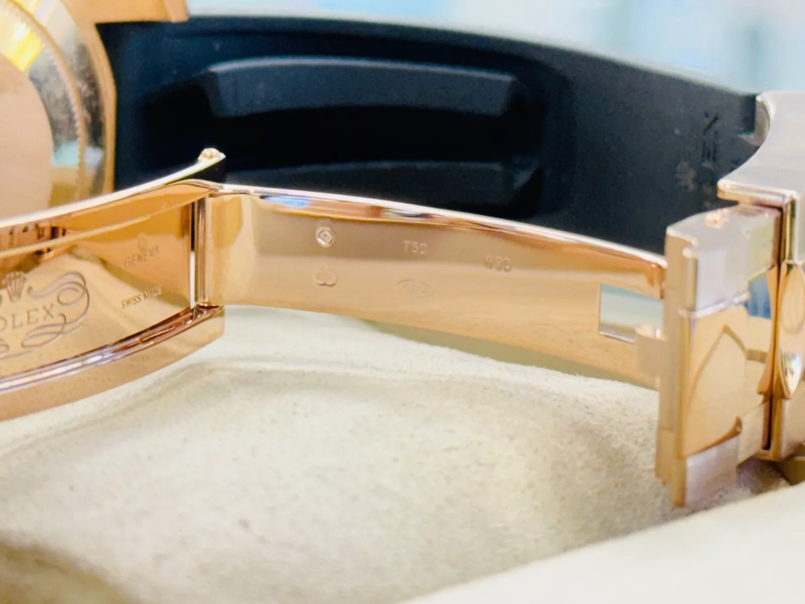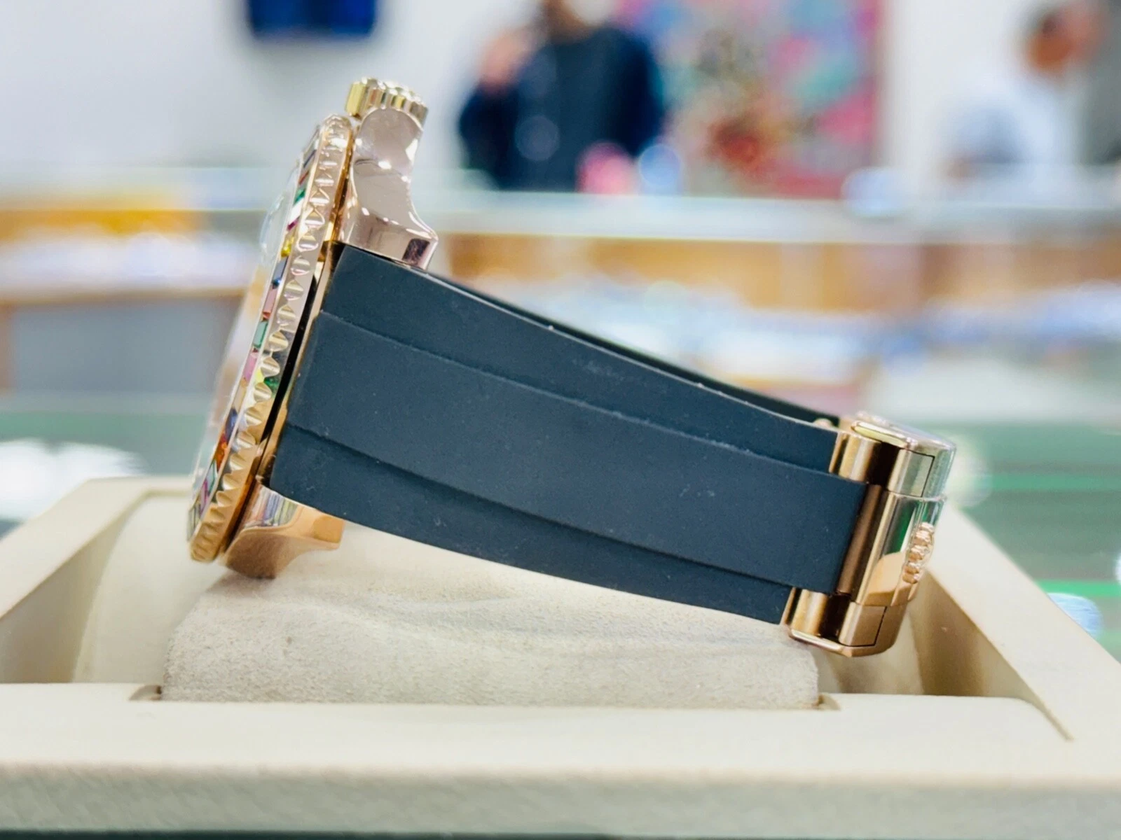 Rolex Oyster Perpetual Yacht-Master 40 mm 18k Everose Gold with Bidirectional Rotatable Gem-Set Bezel features 32 Sapphires, 8 tsavorites and one Diamond and Diamonds Pave Dial with Everose Gold Luminous Hands and Luminous Hour Markers. Oyster case is Stainless Steel with Screw-Down Crown and antireflective Sapphire Chrystal with Magnifier – Cyclops Lens. The date indicator located on 3 o’clock. The watch has Matt Black Oysterflex bracelet with 18k Everose Gold Oysterlock.